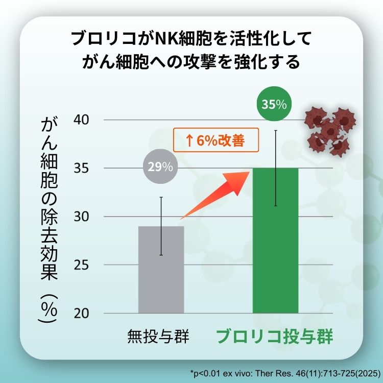 2025年に発表された別の研究では、ブロリコの投与によって、血液中のNK細胞が、がん細胞を減らす力が向上することもわかりました。