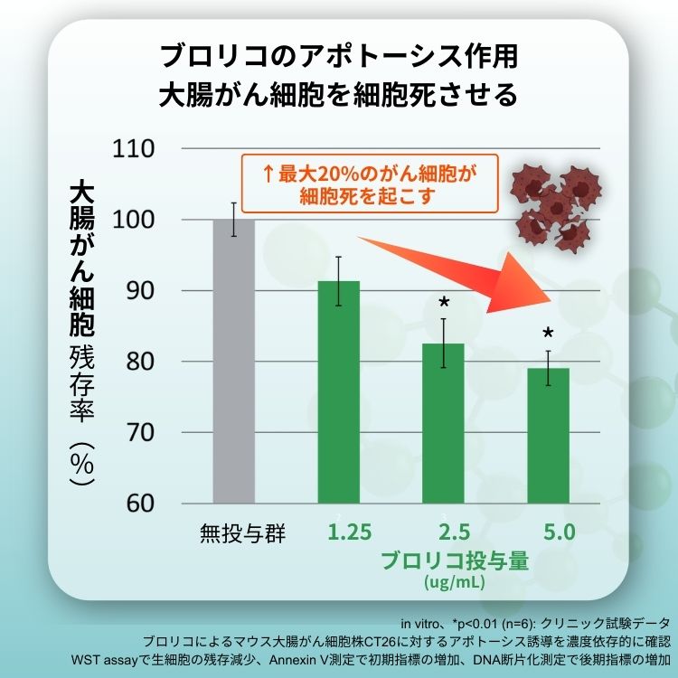 細胞試験レベルでは、大腸がん細胞に対して、ブロリコによるアポトーシス効果が確認されています。