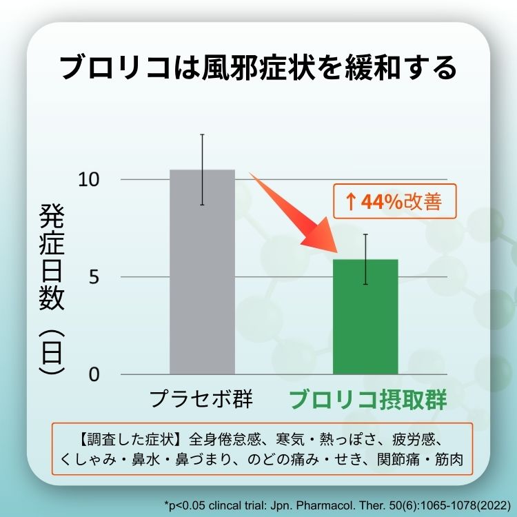 その結果、ブロリコを摂取した群では、プラセボ群と比べて、症状が現れた日数が約44%少ないことが確認されています。