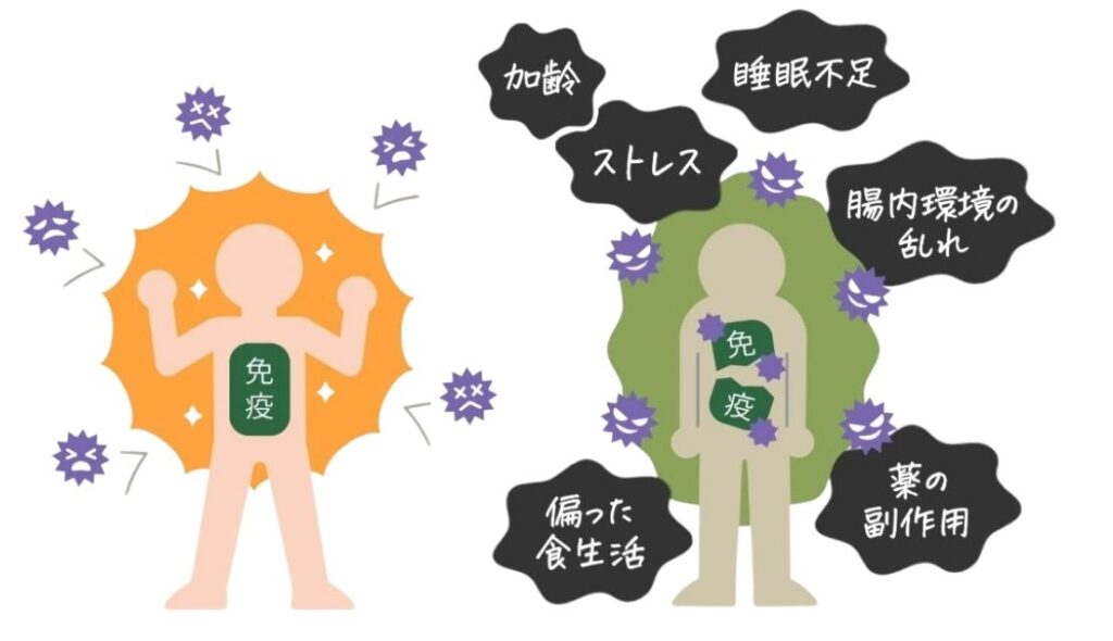 「免疫が落ちる」と聞くと、免疫が“弱くなる/少なくなる”ことをイメージしがちですが、実際はもっと手前で変化が起きます。